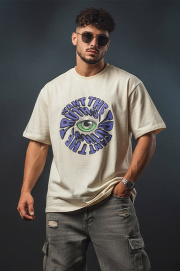 Truth Beige Oversized Chest Graphic Printed T-shirt
